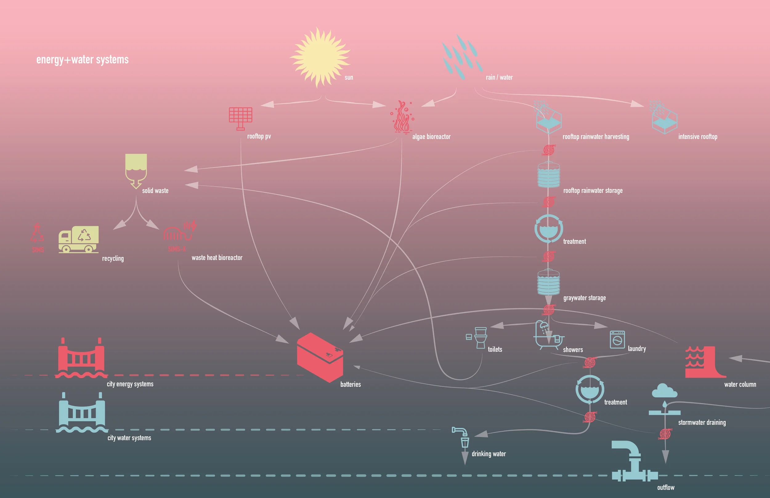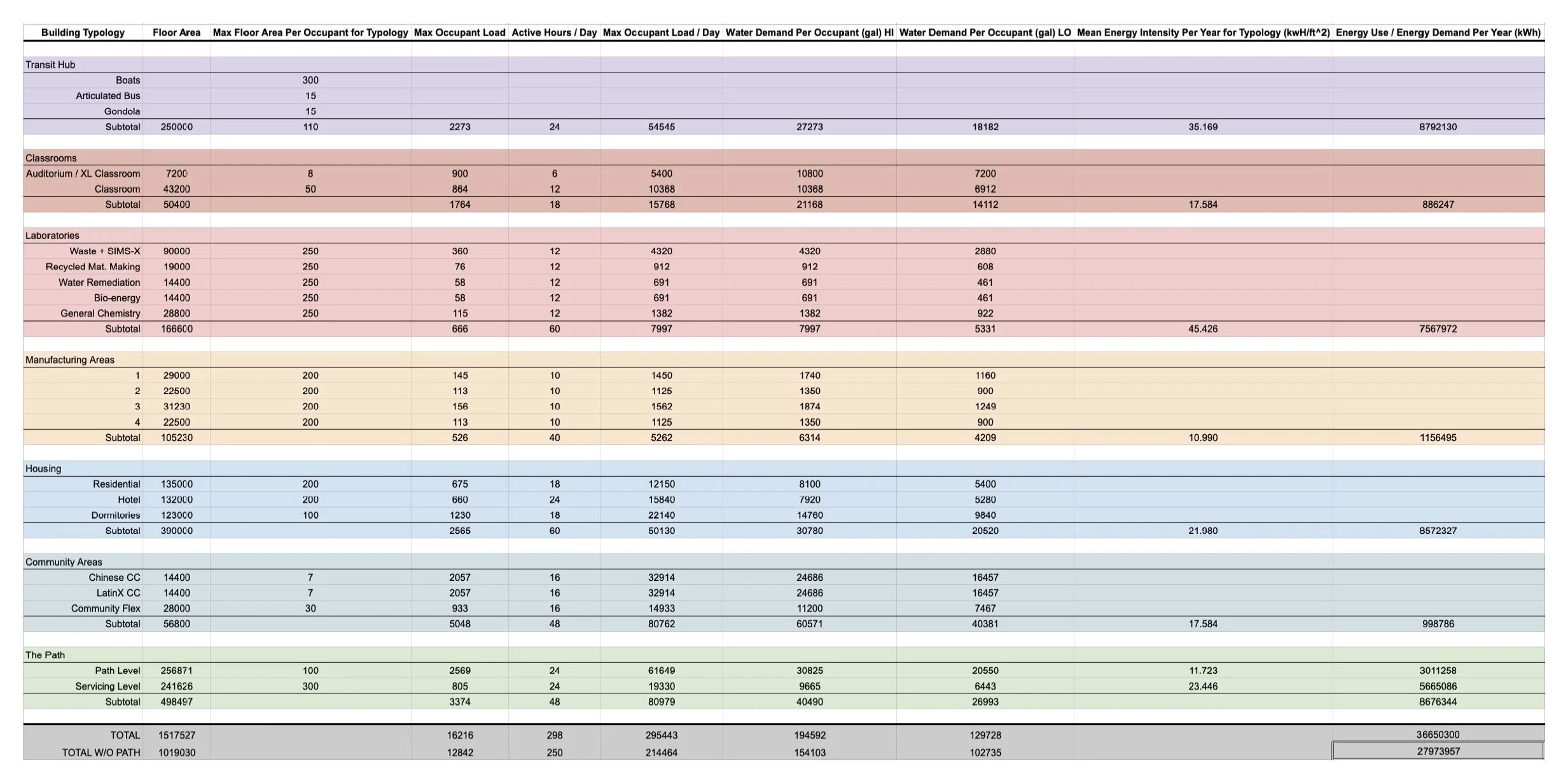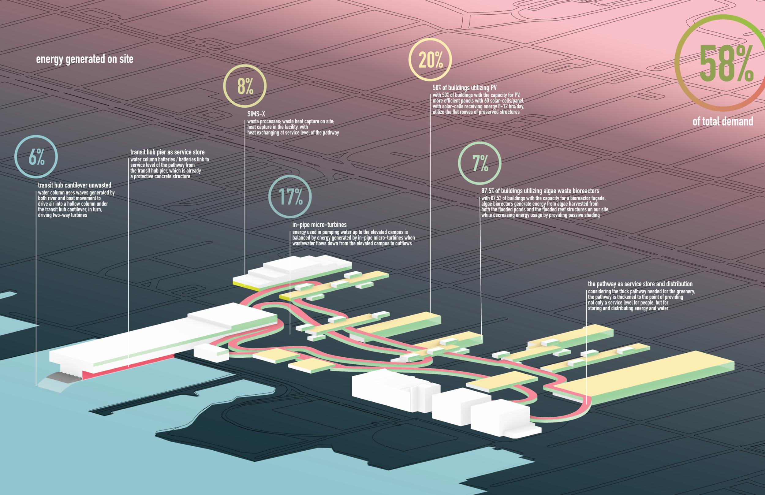 Here, some buildings were selected for removal, others for rebuilding, all reprogrammed based on the living lab’s campus and campus living scheme. Most importantly, a new transit hub and selected buildings would be home to energy and water systems that would allow for the whole 22-building campus in providing for 58% of its energy demand — and reuse 100% of its water (calculations provided below).
