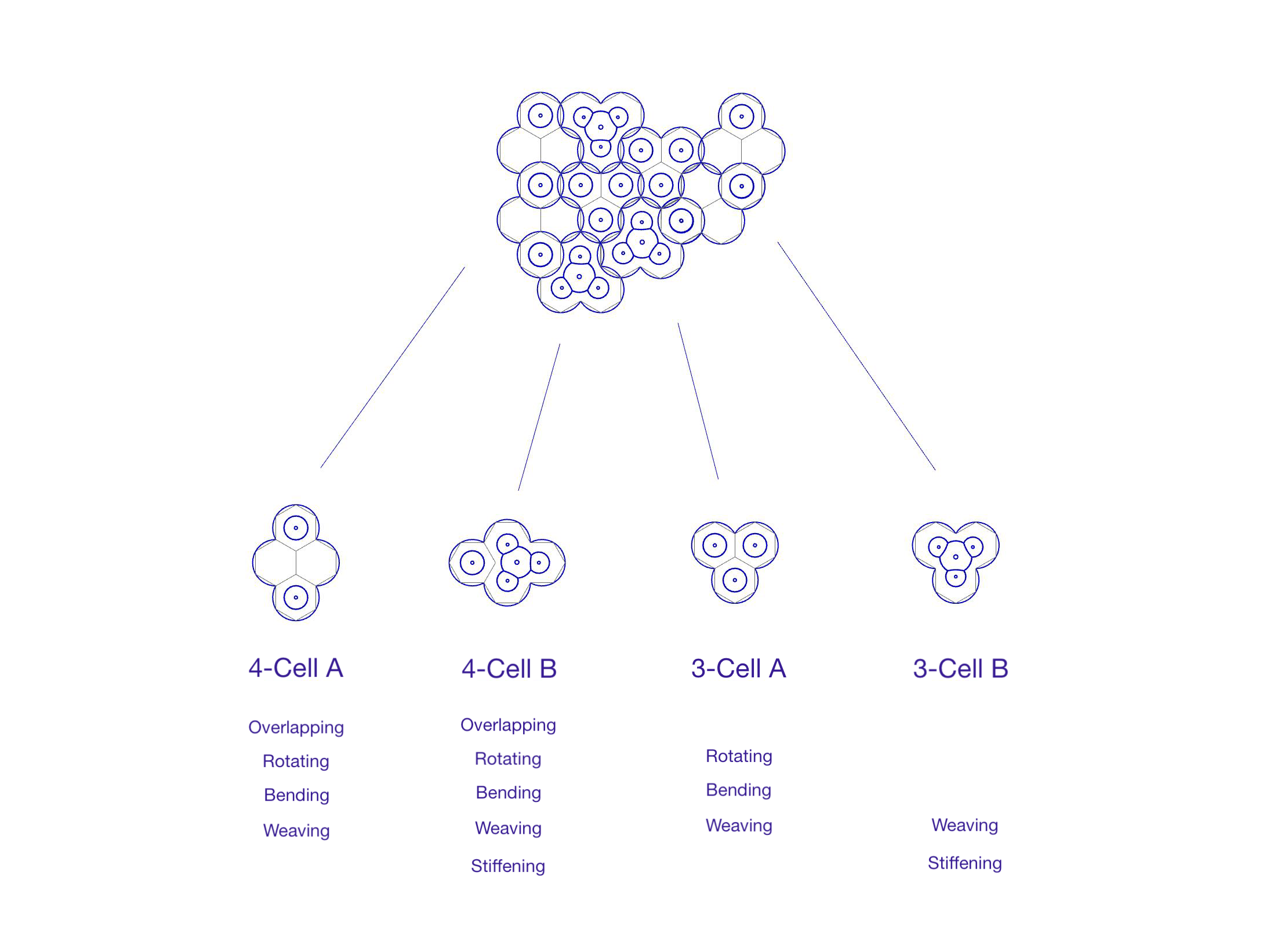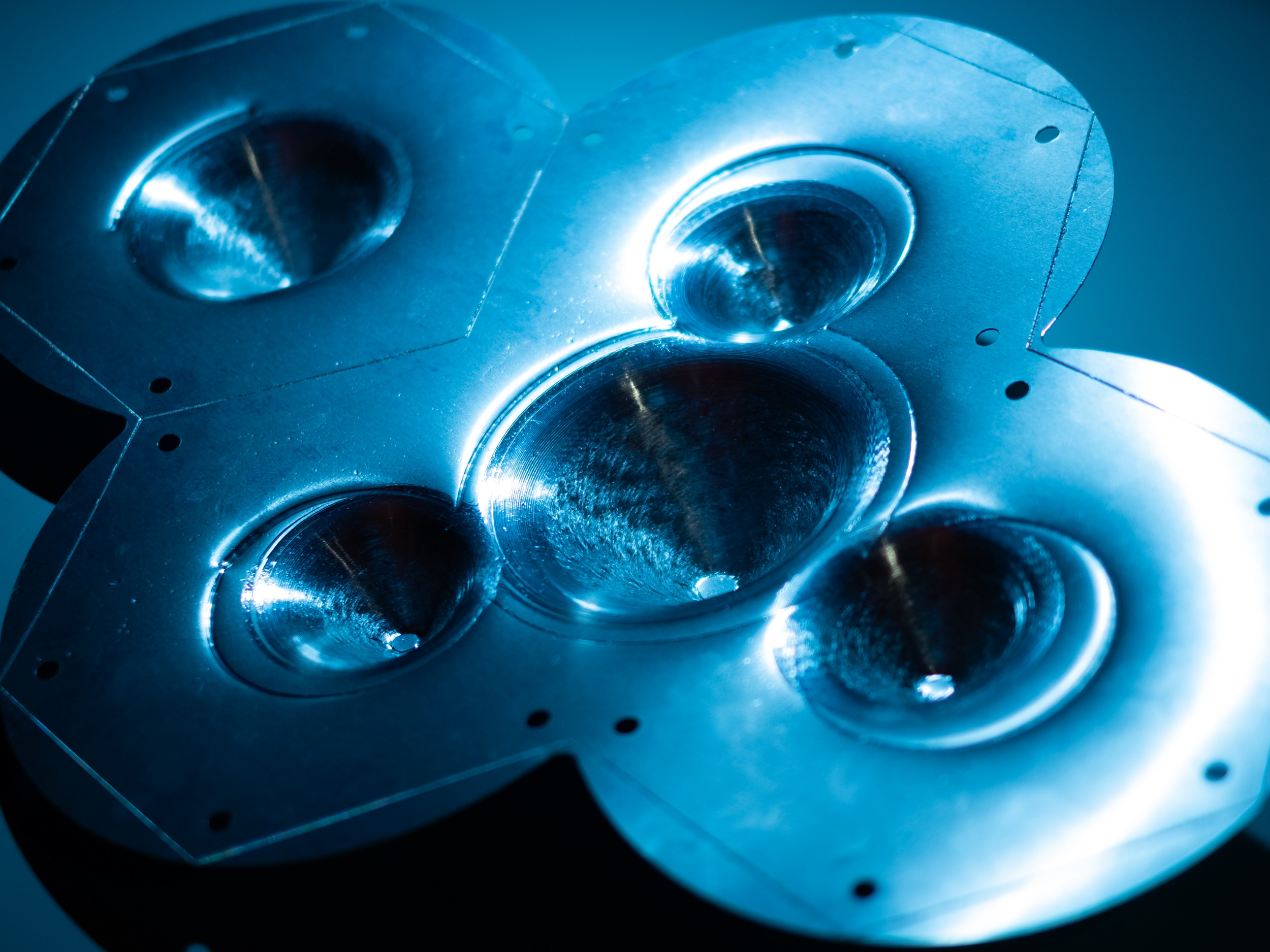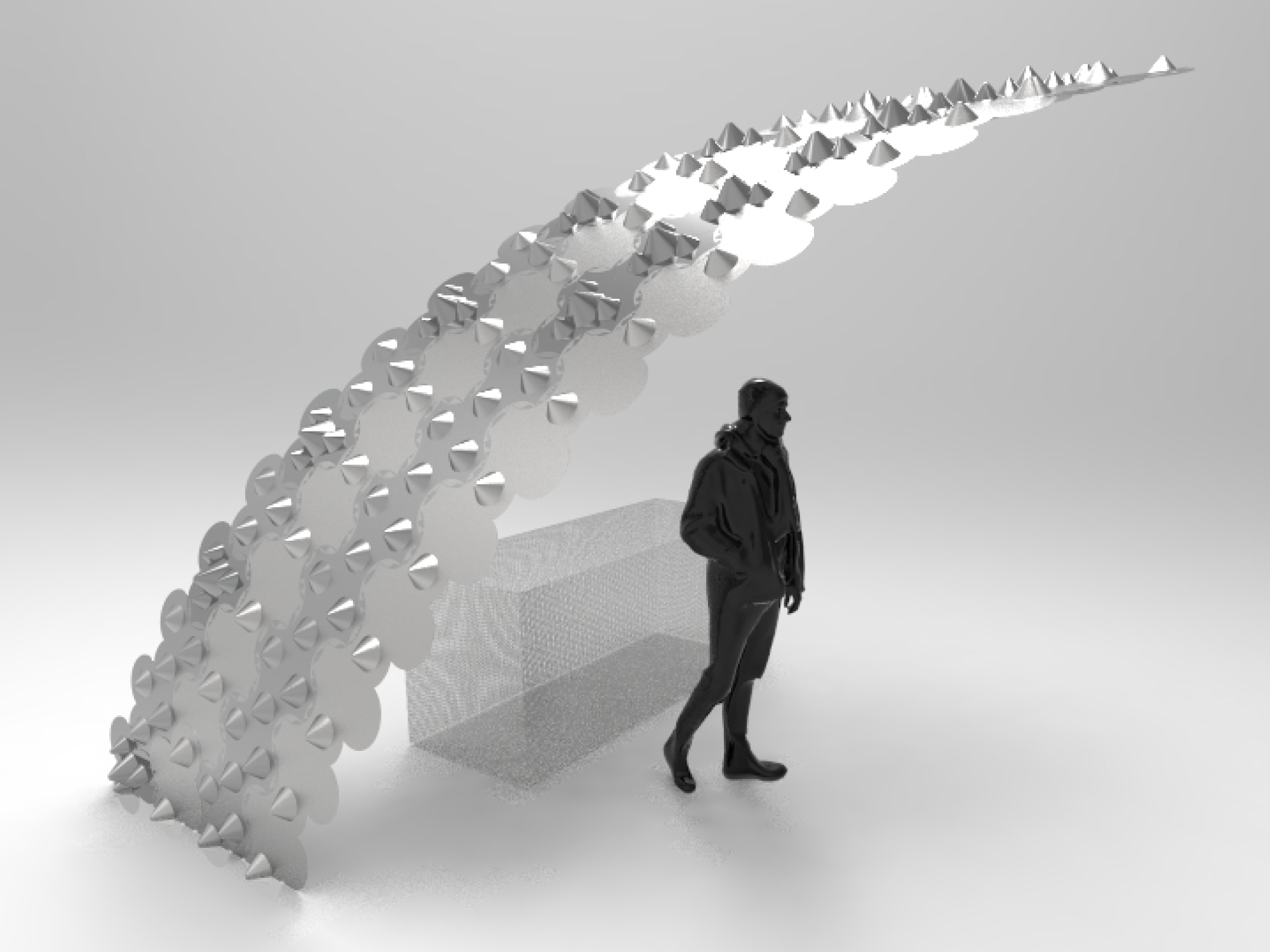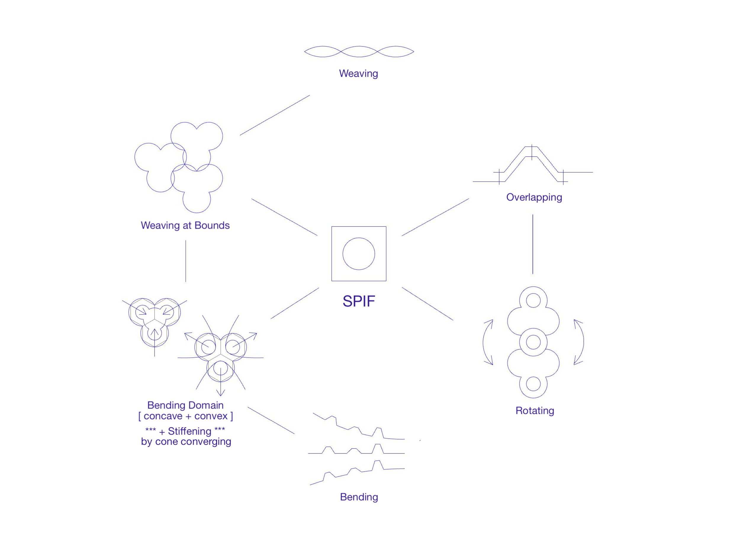 In this case, that material was none other than the readily available standby, zinc. The challenge of working with zinc is how soft it is; yet, that is a perfect condition for testing whether we could utilize SPIF to make rigid panels — and whether they would be amply rigid to build a panelized pavilion with it. Herein I made my greatest contribution — second only to what I contribute in always motivating my peers — that utilizing bubbles/ clustered bubbles for the geometries for SPIF would create arches whereby the forces would create rigidity. More, one could control the rigidity in different areas by clustering them either closer or farther apart.