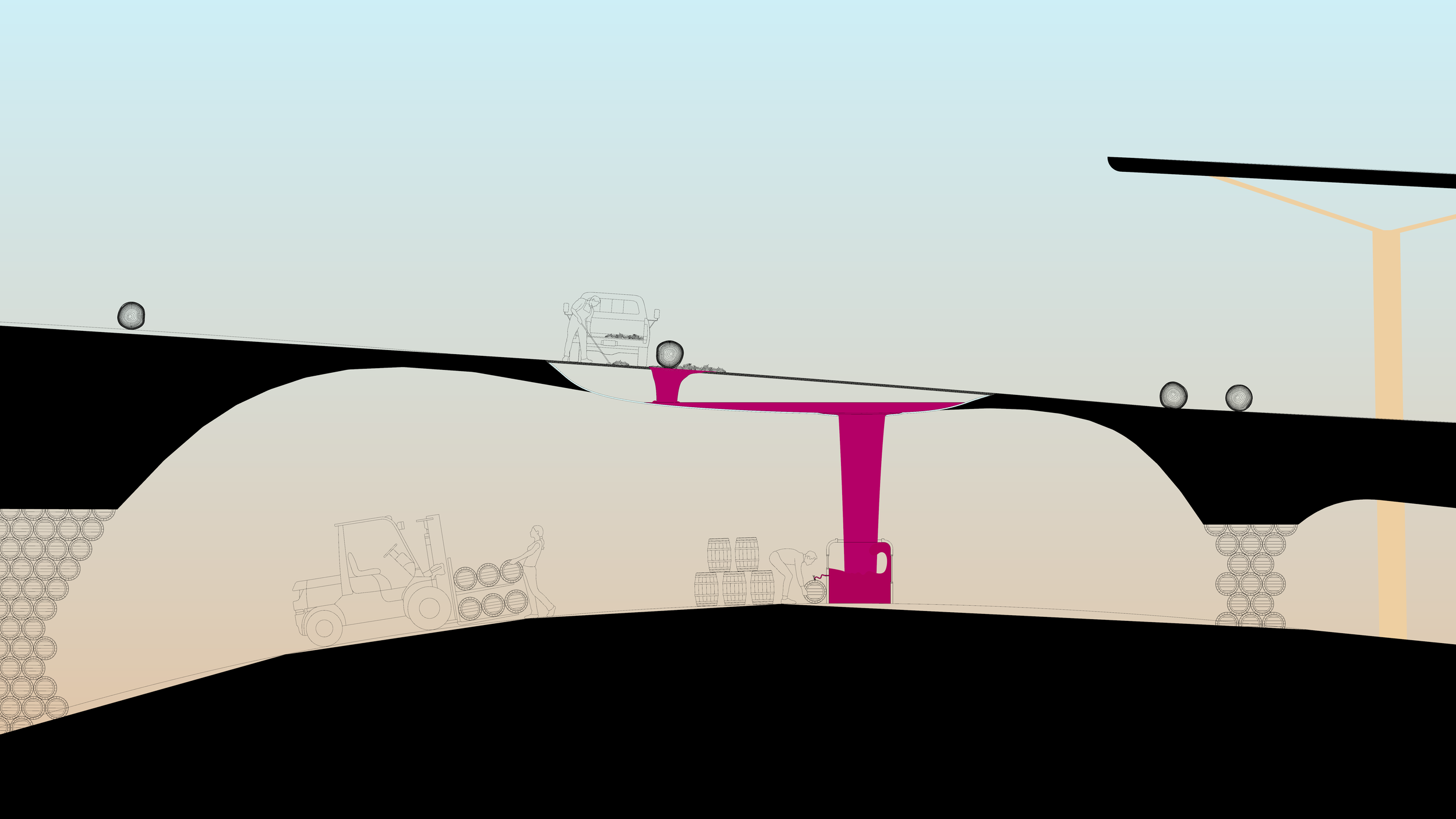 I started mapping flows of wood and wine through and throughout the Hudson Valley to locate where to best position this operation. In designing for the land, wood and wine fabrication, fabrication tech, and for ease of distribution of finished products, I was inspired by how the AA’s fabrication tech was incorporated into their completely open-air operation in Hooke Park. With that, I finally detailed out how to — literally — do it all under one roof.